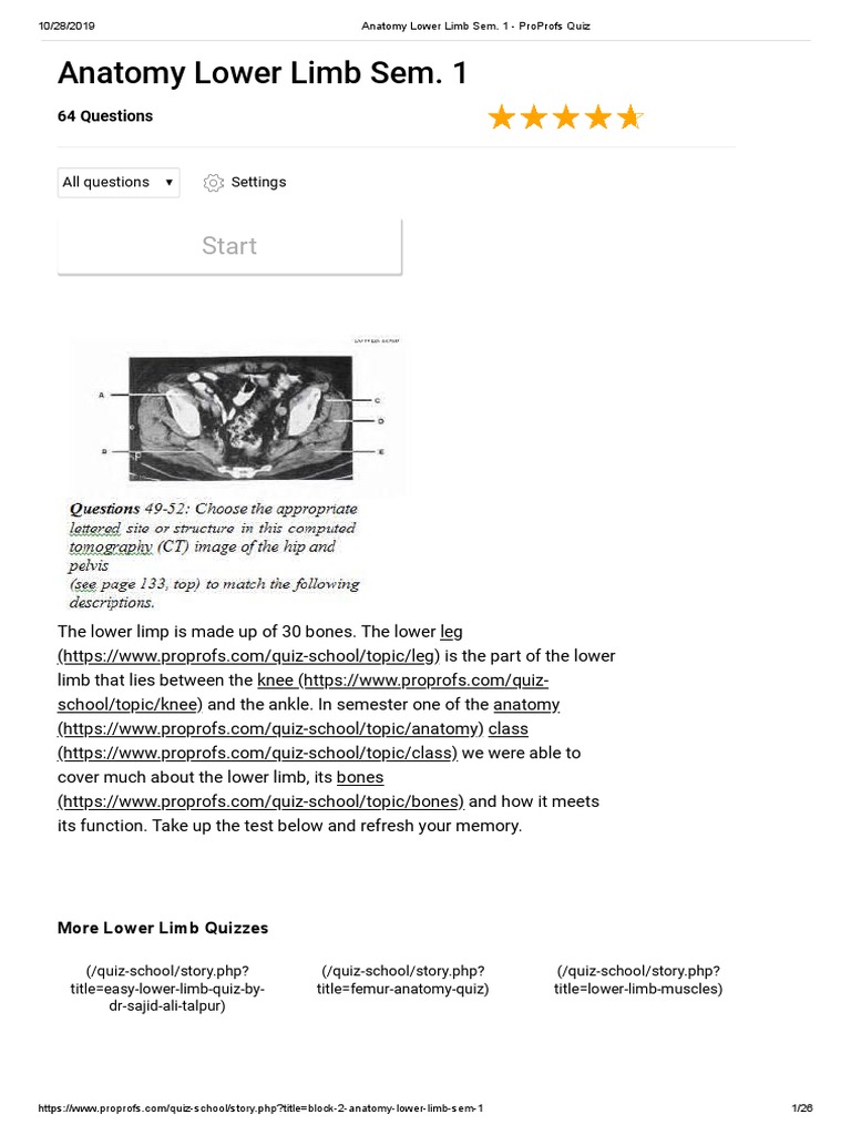 32+ Lower Limb Anatomy Quiz. There is a printable worksheet available for download here so you can take the quiz with pen and paper. 10 trivia questions, rated average.